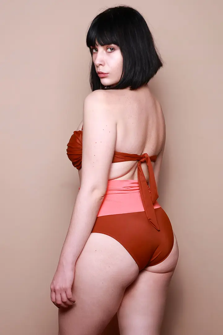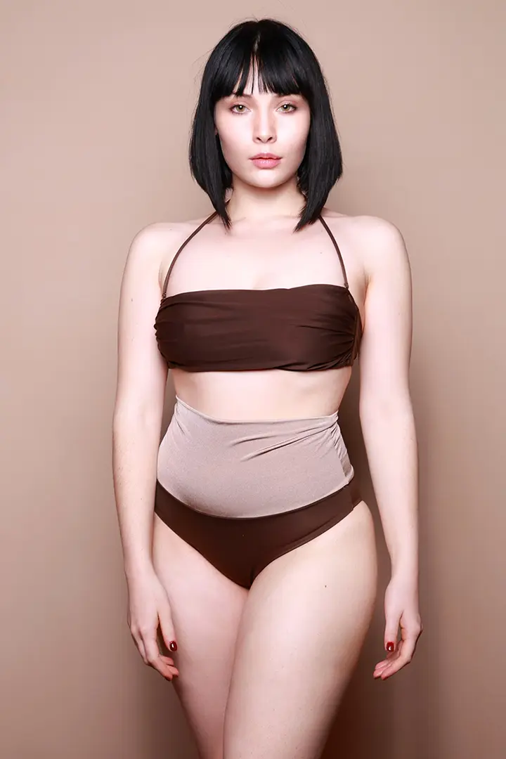 Elegante bikini bicolore con top a fascia in tessuto lycra doppiato, effetto foulard con stecche laterali di sostegno, annodato sul retro con fiocco che ricorda il modello Vittoria. Corredato di coppe e laccetto intorno al collo entrambe rimovibili. Lo slip a vita alta è sgambato con una fascia in tessuto morbido e cangiante di diverso colore, drappeggiato e da indossare come si preferisce, a vita alta o bassa.